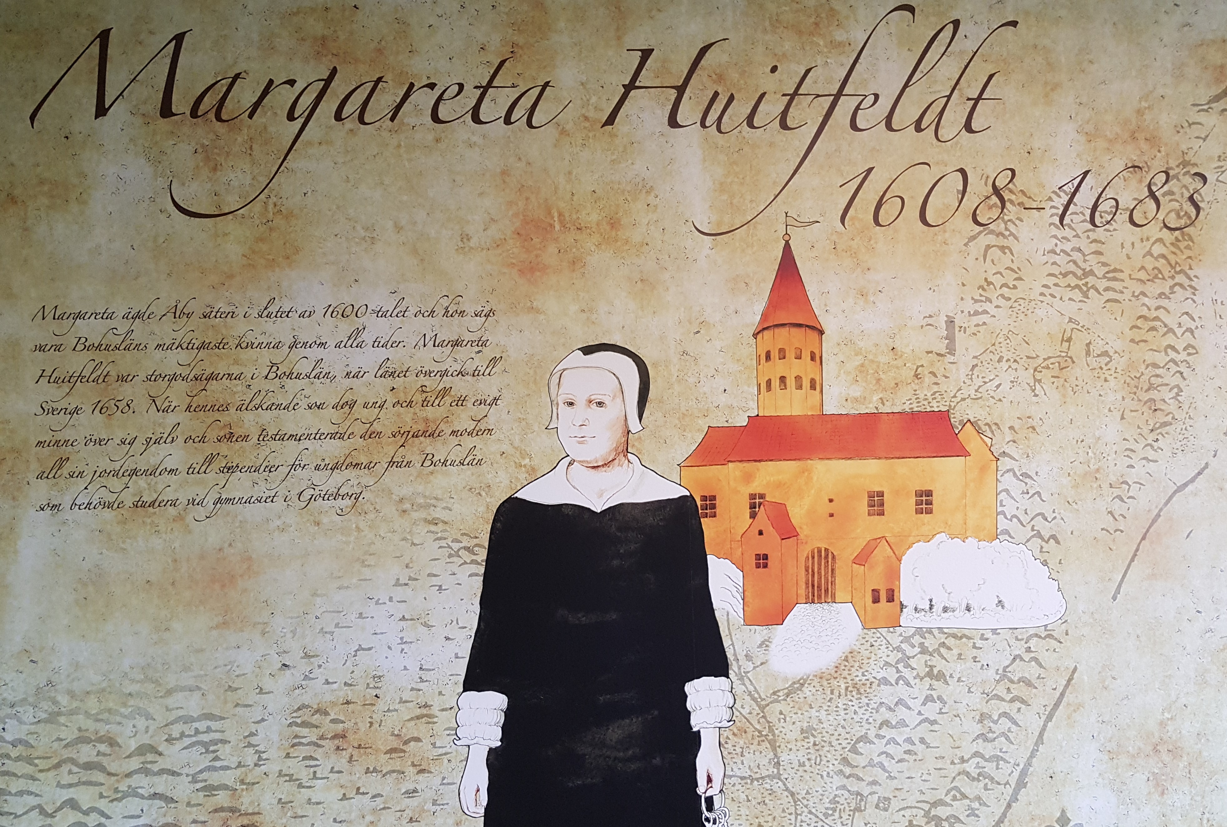 Thought of as one of Bohus county’s most distinguished women. In her time, she was counted among the richest people in Bohus. The widow of Danish nobleman Tomas Dyre, Margareta was a member of the Bohus nobility when she bought Åby in 1661, thus becoming one of the major landowners in Bohus county. At that time the estate comprised the main manor (today’s manor house) together with some 20 dependent farms in Tossene parish. It wasn’t only these farms that were managed by Margareta. She owned farms in most of Tjörn and down to Hisingen and northern Halland. It was said that she managed her farms ‘with wisdom, thrift and meticulous care’. Margareta lived on her farm, Sundsby manor, at Tjörn and it is there she preferred to be, and where most of the correspondence she left is dated. From time to time she stayed at Åby manor, and she is said to have had her own bench at Tossene’s old church.